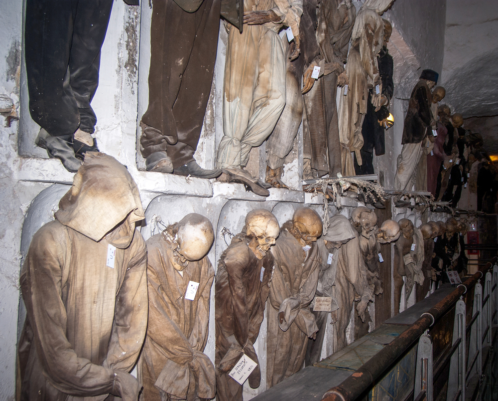 Famosissime catacombe piene dei corpi naturalmente mummificati degli abitanti della città dal XVII al XIX secolo. Qui troverai, in teche di vetro e cristallo, centinaia di scheletri e mummie di frati perfettamente conservati. Fra questi corpi si trova forse anche quello di Cagliostro, il famoso alchimista. Una delle mummie più famose e meglio conservate è quella della piccola Rosalia Lombardo, morta di polmonite ad appena 2 anni.